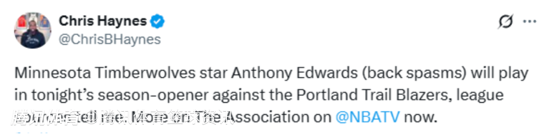 赛前据名记Haynes报道,遭遇背部痉挛的森林狼当家球星爱德华兹,本场比赛确定出战。森林狼的首发阵容为:爱德华兹、迪文琴佐、兰德尔、戈贝尔、麦克丹尼尔斯。