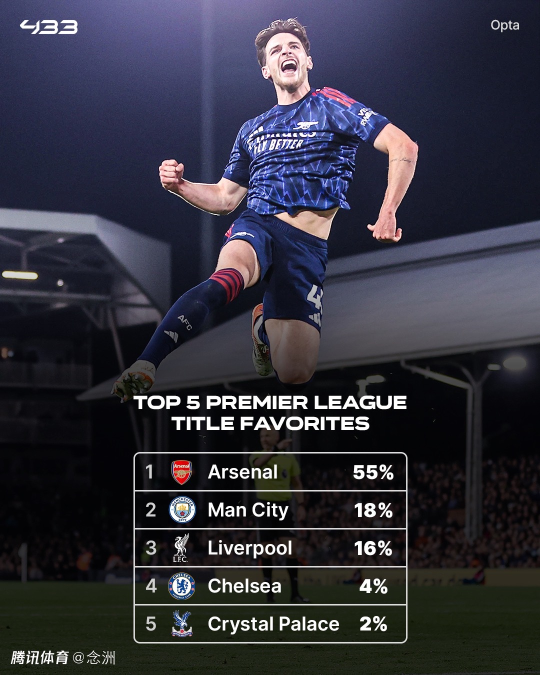 英超方面,阿森纳前8轮6胜1平1负积19分,高居榜首,领先第二名曼城3分,领先卫冕冠军利物浦4分。opta同样认为他们最有希望夺冠,概率居然高达55%,超过一半!