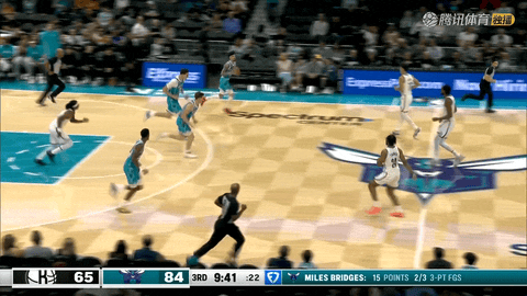 易边再战,第3节还剩11分43秒时,卡尔克布伦纳接布里奇斯妙传轻松上篮得手,黄蜂将比分改写成79-60。
