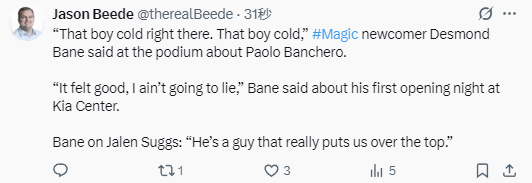 在谈到队友班凯罗的表现时,贝恩表示:“那家伙太厉害了。太厉害了。”在谈到自己在魔术队的首秀感受时,贝恩说道:“说实话,感觉很棒。”