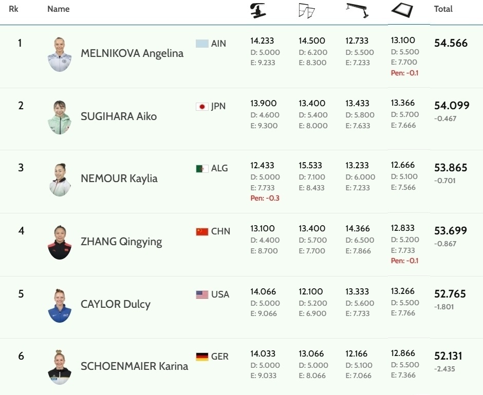 从资格赛成绩来看,暌违国际赛场3年之久的俄罗斯选手,以中立运动员身份回归的梅尔尼科娃,以54.566排在第一:除开平衡木失误只有12.733外,其余三项都很不错,跳马14.233位列全能选手第一;高低杠14.50排名第二;自由操13.10位列第九。