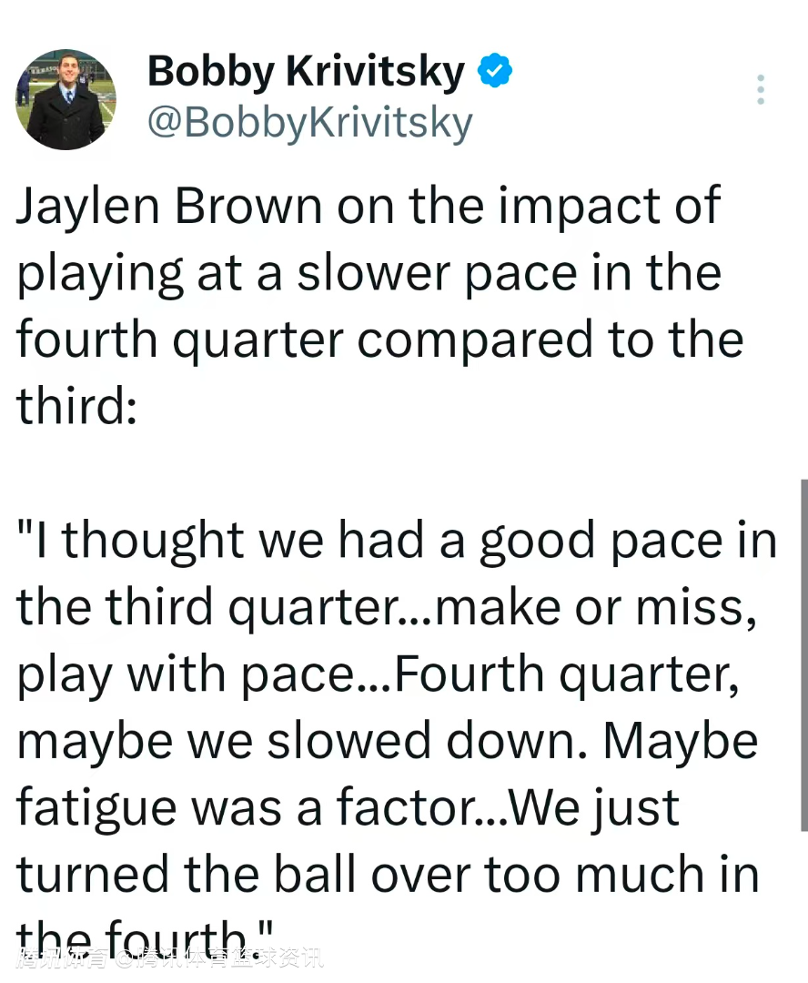 杰伦-布朗:第四节我们节奏慢下来或许因疲劳影响 而且第四节失误实在太多了