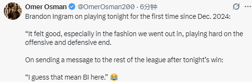 在谈到这场比赛传递了什么信号时,英格拉姆说道:“我倒不觉得这是在传递特定信号,更多是队友们日复一日的专注与刻苦训练的成果。我们每天都在努力变得更好,虽然不可能每场比赛都像今晚这样顺利,但我们会互相激励、共同进步,今晚大家确实做得很棒。”