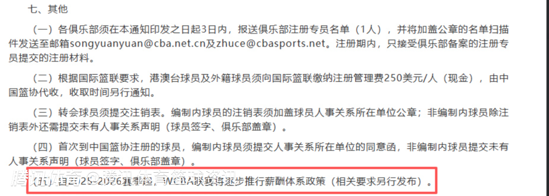 2025-10-23 11:30北京时间10月23日,据博主我爱女篮报道,中国篮协官网日前公布了2025-2026赛季中国女子篮球联赛注册有关事宜的通知。该通知除对球员、教练员的注册条件进行详细阐述外,还透露自2025-2026赛季起,WCBA联赛将逐步推行薪酬体系政策,可以通俗地理解为设立“工资帽”,这将是有可能改变联赛未来格局的重大举措。