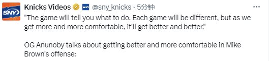 在谈到布朗的战术体系时,阿奴诺比表示:“之前大家讨论的核心问题都是围绕这一点,但归根结底,防守才是关键。优秀的球员必须确保自己能在比赛末段打出一些关键表现,而且多数时候还要在防守和篮板端有所贡献。比赛会告诉你该怎么做。每场比赛的情况都不一样,但随着我们(对体系)越来越适应,一切都会变得越来越好。”