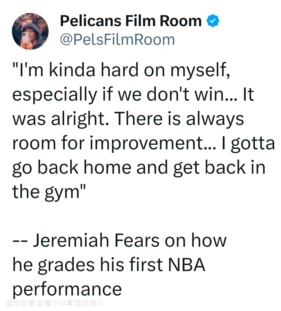 费尔斯谈及自己如何评价个人NBA首秀表现时说道:“我对自己要求挺严格的,尤其是在球队输球的时候。这次表现还算可以吧,但总有提升的空间。我得回家,然后回到训练馆继续苦练。”