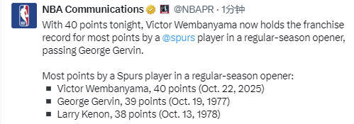 文班揭幕战0失误砍40+15!创马刺队史新高 比肩3大内线巨星