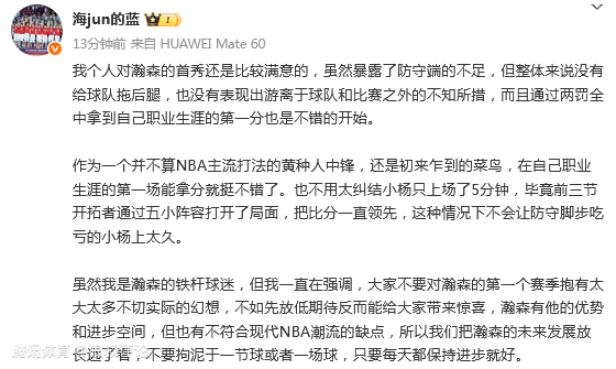 媒体人“海jun的蓝”发文点评:我个人对瀚森的首秀还是比较满意的,虽然暴露了防守端的不足,但整体来说没有给球队拖后腿,也没有表现出游离于球队和比赛之外的不知所措,而且通过两罚全中拿到自己职业生涯的第一分也是不错的开始。