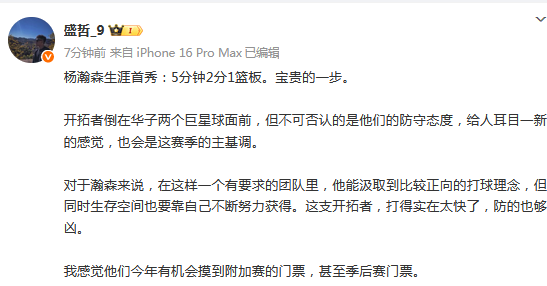 媒体人“盛哲”发文点评:开拓者倒在华子两个巨星球面前,但不可否认的是他们的防守态度,给人耳目一新的感觉,也会是这赛季的主基调。
