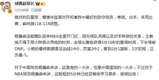 媒体人赵探长发文点评:杨瀚森没能随队迎来NBA生涯开门红,因为球队风格以及对手阵容的关系,主教练不得不用小阵容占用他的时间,全场比赛他获得5分16秒的登场时间,下半场被DNP。小杨的最终数据是运动战1中0,罚篮2中2,拿到2分1篮板,1次犯规,正负值-5。