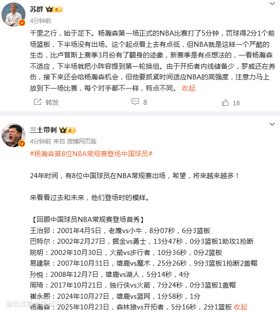 中国球员杨瀚森登场5分钟,得到2分1篮板,至此,结束了个人的首次NBA常规赛之旅。他的表现也引起了国内媒体的热议。