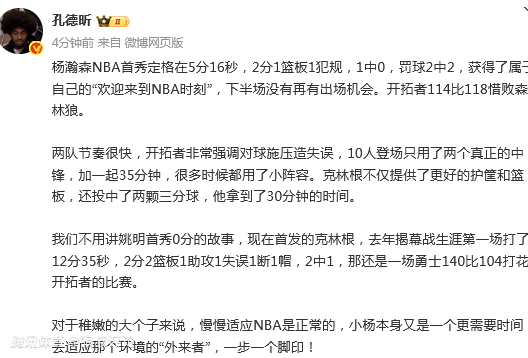 媒体人“孔德昕”发文点评:杨瀚森NBA首秀定格在5分16秒,2分1篮板1犯规,1中0,罚球2中2,获得了属于自己的“欢迎来到NBA时刻”,下半场没有再有出场机会。开拓者114比118惜败森林狼。