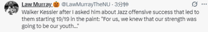 在谈到自己的表现时,凯斯勒说道:“我觉得很多NBA球员应该都会认同,你永远不希望自己的比赛陷入停滞,总是想不断提升自己。所以这也是我一直在努力的方向。而且你也知道,我的队友们做得很好,总能找到空位的队友。所以,这种感觉确实很好,但更让我觉得开心的是,每个人都能全身心投入比赛,这才是最棒的。”