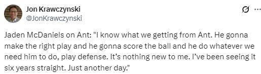 在谈到爱德华兹的表现时,麦克丹尼尔斯表示:“我清楚爱德华兹能为球队带来什么。他总能做出正确的进攻选择,也能稳稳得分,还会完成我们需要他做的一切,比如防守。对我来说,这没什么新鲜的,我已经连续六年看到他这样打球了,今天不过是又一个平常的日子罢了。”