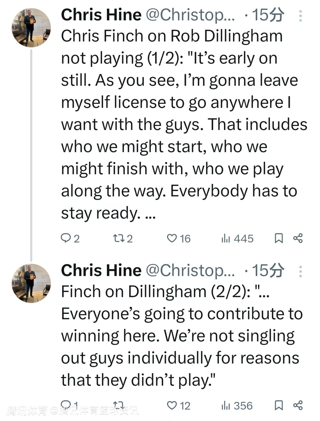 “在森林狼阵中,每个人都会为赢球贡献力量。我们不会因为某些球员没上场就单独针对他们。”
