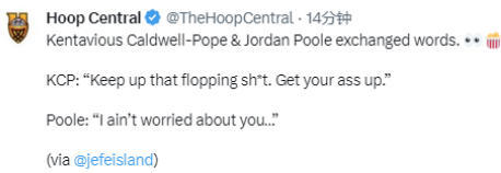 从视频中可以看到,当时普尔投射三分球,波普跑过来防守,普尔出手后摔倒,而波普则直接开喷:“少来假摔这种破事,赶紧起来。”而普尔则回应道:“我一点也不在乎你。”