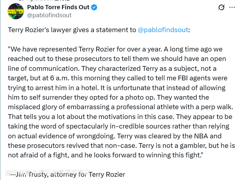 NBA早已为罗齐尔洗清嫌疑,而这些检察官却重提这起本就不成立的案件。罗齐尔并非赌徒,但他也绝不畏惧抗争,他期待能赢得这场斗争的胜利。”