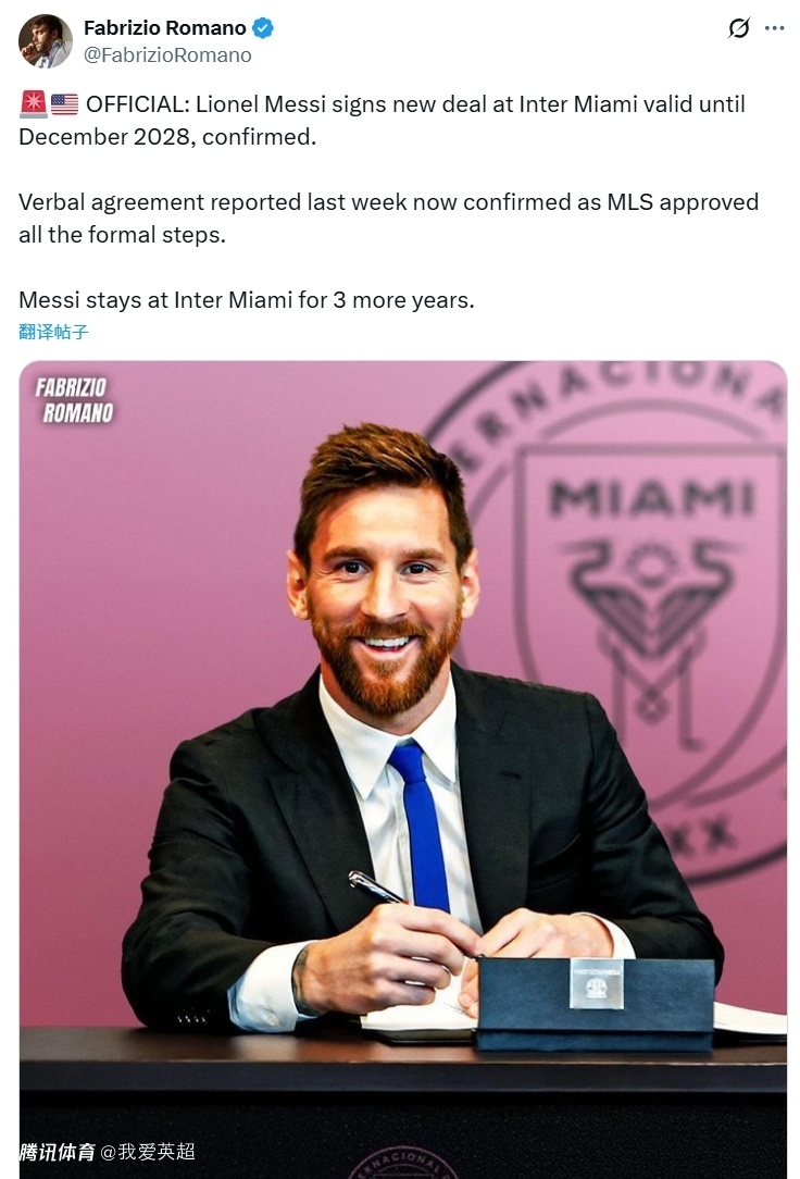 原本梅西与迈阿密国际的合同,在今年年底到期。而根据知名转会专家罗马诺表示,梅西与迈阿密国际将会续约至2028年。随着梅西续约3年,这也意味着梅西世界杯后不会退役,而是至少踢到41岁。