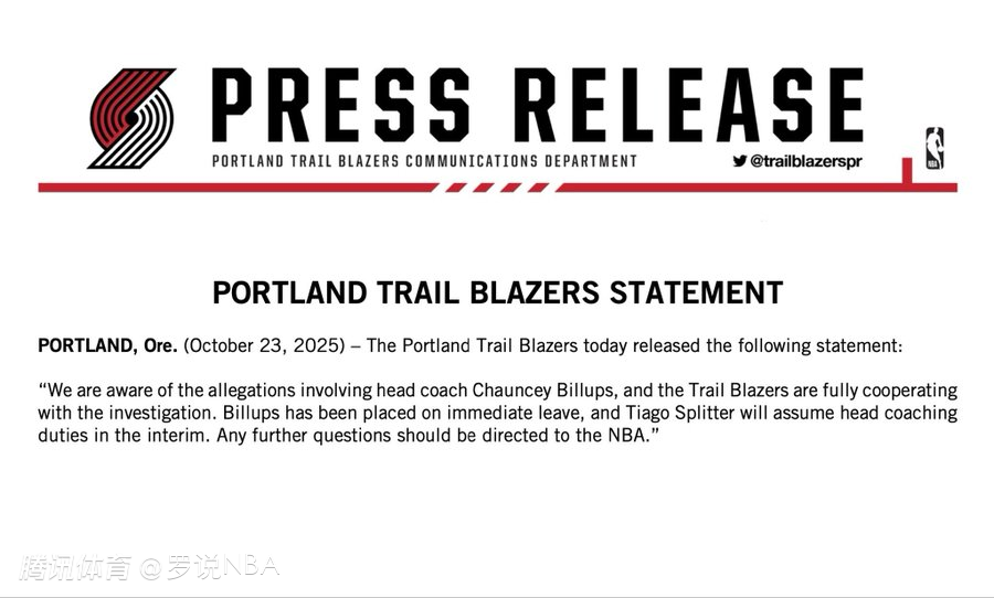 2025-10-24 07:00北京时间10月24日,波特兰开拓者队发布官方声明:“我们已知晓涉及主教练昌西-比卢普斯的指控,开拓者队正全力配合调查。比卢普斯已被立即停职,蒂亚戈-斯普利特将暂时接任主教练职务。”此前,比卢普斯因涉及参与非法扑克游戏被捕,还被指控洗钱、电信欺诈共谋等多项罪名。