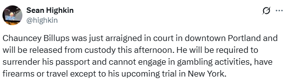 记者Sean Highkin报道,比卢普斯刚刚在波特兰市中心出庭接受提审,预计将在今天下午获释。但他被要求交出护照,并不得参与任何赌博活动、持有枪支或旅行,除非是前往纽约出席即将到来的庭审。