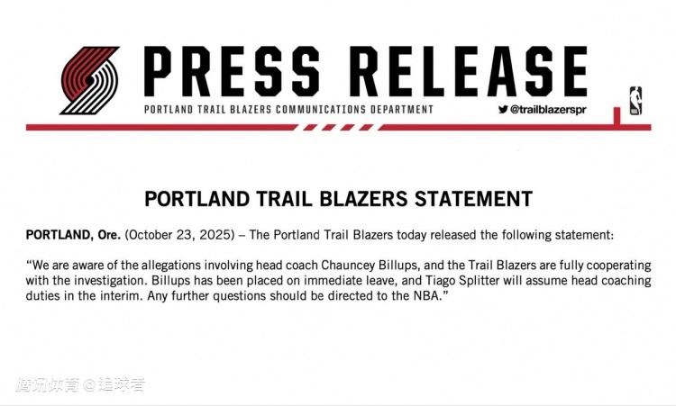开拓者官方发表声明:我们已知晓有关主教练昌西-比卢普斯的指控,波特兰开拓者正全力配合调查,比卢普斯即日起暂停职务,临时主教练一职将由斯普利特暂代,所有后续进展将由NBA统一处理。