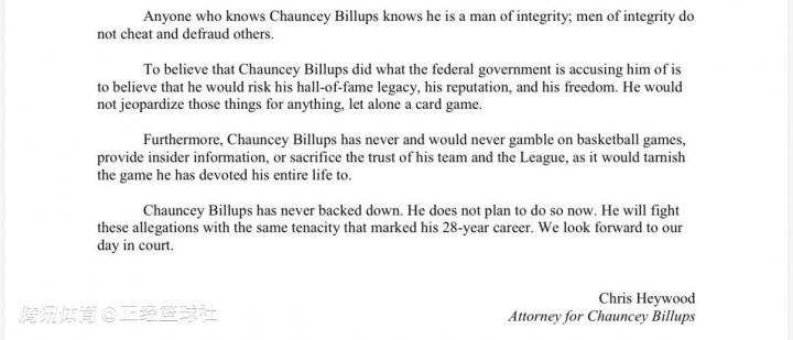 此外,昌西-比卢普斯从未也绝不会参与篮球赌博、泄露内幕信息,或背弃球队与联盟的信任——这都将玷污他奉献终身的体育事业。昌西-比卢普斯从未退缩,此刻亦无此打算。他将以贯穿其28年职业征程的坚韧意志直面各项指控。我们期待在法庭上呈明真相。