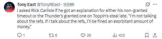 托平抢断裁判却吹雷霆先暂停?卡莱尔:我不想评论判罚 罚款金额很高