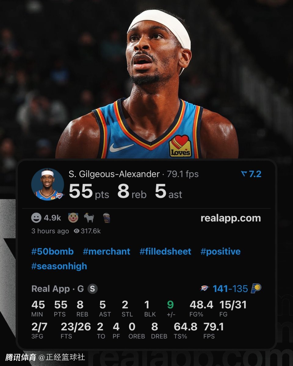 在本场比赛中,雷霆队球星亚历山大一共出战45分钟,31投15中,其中三分球7投2中,罚球26投23中,得到55分8篮板5助攻2抢断1封盖。其中,单场55分也创造了亚历山大个人生涯单场的得分新高。