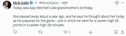 2数据创新高!阿贾伊-米切尔:今天是已故祖母生日 我在赛前一直在思念她