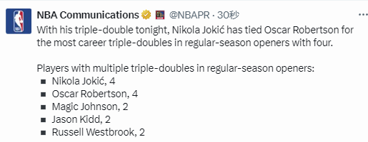 约基奇生涯第4次揭幕战砍三双 追平大O并列历史第一