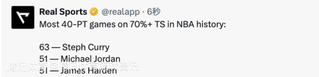 此外,库里也是NBA历史上以真实命中率70%+拿到40+得分场次最多的球员,乔丹和哈登都是51场。