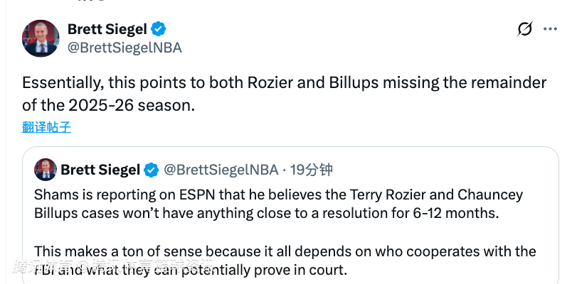 赛季结束了!Shams:罗齐尔和比卢普斯案件未来6-12个月内都不会有任何结果