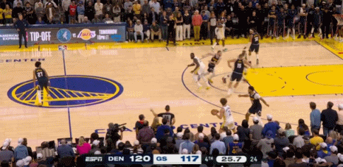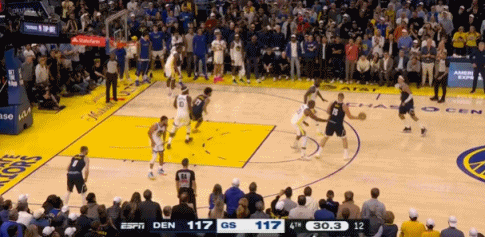 在第四节还剩下20多秒的时候,戈登命中一记三分球,帮助掘金反超3分,但之后库里命中一记超远三分,帮助勇士扳平比分,将比赛拖入加时赛,在命中这记三分后,库里还特意对着摄像机让掘金赶紧喊暂停。