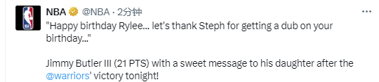 巴特勒说道:“Rylee(巴特勒的女儿),生日快乐,感谢斯蒂芬(库里)在你生日这天帮球队拿下一场胜利吧。!今天我女儿六岁了,感谢这个美好的生日时刻。接下来我们有项重要任务,要背靠背拿下胜利!”