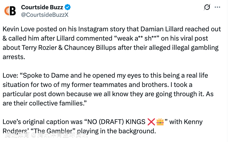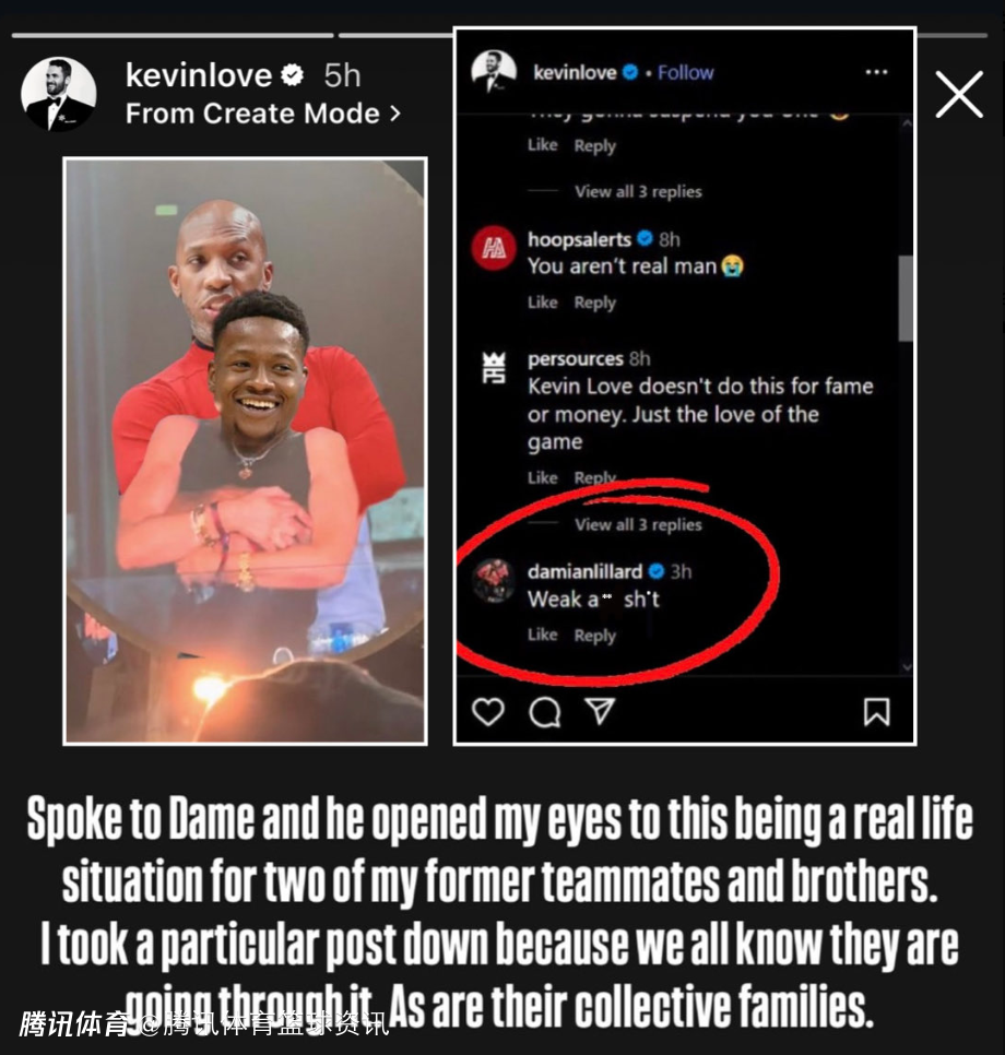 乐福在稍早前再度更新社媒,并且写道:“和利拉德聊过之后,他让我意识到这对我的前队友兼兄弟来说是真实的人生困境。我删除了那条特定的帖子,因为我们都知道他们正在经历这一切,他们的家人也同样在承受。”
