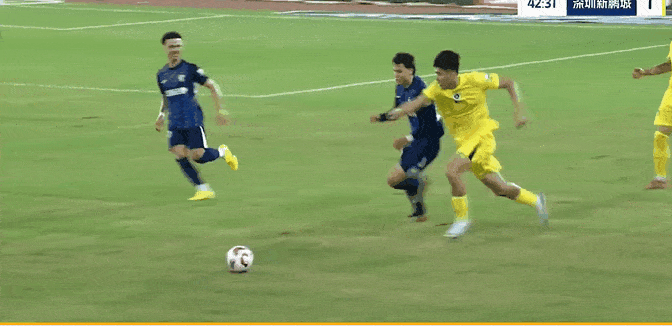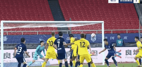 第41分钟,深圳左侧界外球到禁区制造混乱,韦斯利头球摆渡到门前,朴志洙头球解围见高不见远,加西亚抢在郭嘉宇前头球抢点破门,深圳1-0领先。