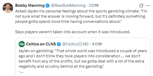 当被问及NBA及其他体育赛事周边的赌博风气时,杰伦-布朗表示:“就我个人而言,整个赌博圈子是在几年前才兴起的,我认为他们推进赌博相关业务的各方并没有考虑到球员的感受,尤其是赌博背后所伴随的风气、行为,以及这些因素与球员之间存在的直接关联。”