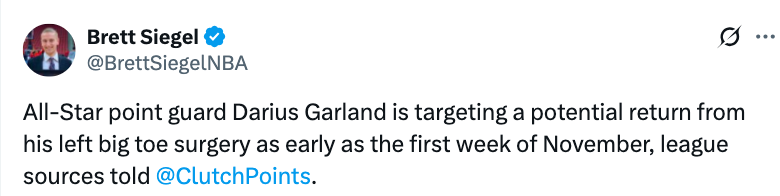 2025-10-25 01:10北京时间10月25日,据美记Brett Siegel报道,骑士后卫加兰正计划在11月首周复出。