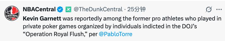托雷透露,有一批前职业球员参加了这个非法高额扑克牌局,而这个发生在19年的牌局中,前NBA球员加内特正是参与者之一。