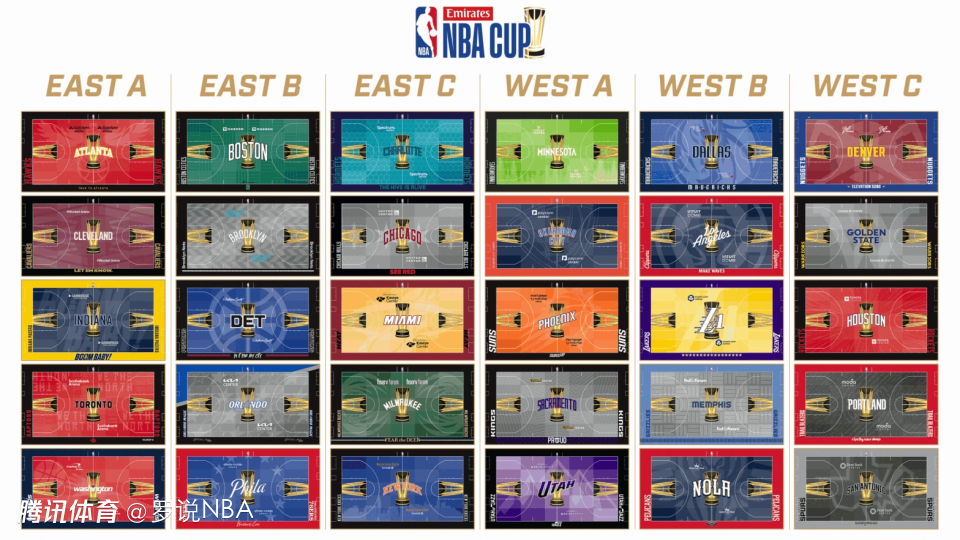 本届NBA杯小组赛将于11月1日开启,持续至11月29日,每周六均会安排比赛。随后,8支球队将晋级淘汰赛,半决赛与决赛则将于12月14日和17日在拉斯维加斯举行。以下是30支球队的具体设计方案,谁的主场最酷炫?