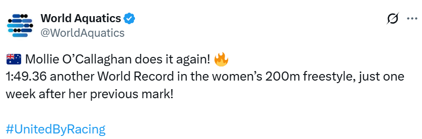 两周前在卡梅尔,她曾以1分50秒77的成绩跻身该项目历史第三;上周在韦斯特蒙特,她又将个人最佳成绩整整提升1秒,一举刷新世界纪录、世界杯纪录、美国公开赛纪录、澳大利亚全国纪录、大洋洲纪录及英联邦纪录。那次成绩是历史上首次突破1分50秒大关,此前舍斯特伦和何诗蓓曾多次向该关口发起强力冲击却未能成功,而奥卡拉汉如今已开始挑战下一个纪录关口。