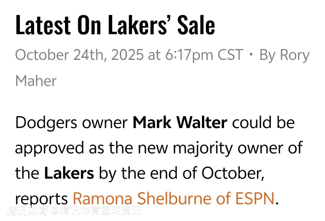 2025-10-25 08:10北京时间10月25日,据ESPN记者Ramona Shelburne报道,洛杉矶道奇队老板马克-沃尔特有望在10月底前获得批准,成为洛杉矶湖人队新的多数股权所有者(大股东)。