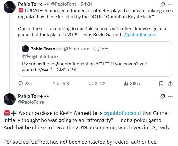 今日,美记者Pablo Torre报道比卢普斯涉赌案件的一些内幕,有一批前职业球员参与了这个非法高额扑克牌局,根据了解这个发生在2019年的牌局的多个消息人士的消息源,这一批前职业运动员的其中之一就是凯文-加内特。