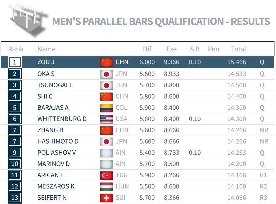 如此这般,对于以领先第二名冈慎之助足足0.933分,以15.466高居资格赛第一的邹敬园来说,只要再拿下这枚金牌,他就能独享世锦赛双杠金牌王这一美名。