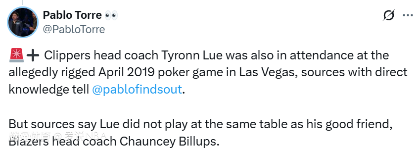 随后,托雷表示,熟悉情况的消息人士透露,快船主教练泰伦-卢也参与了2019年4月在拉斯维加斯进行的涉嫌被操纵的非法高额扑克牌局。消息人士表示,卢和他的好朋友比卢普斯并不在同一桌打牌。