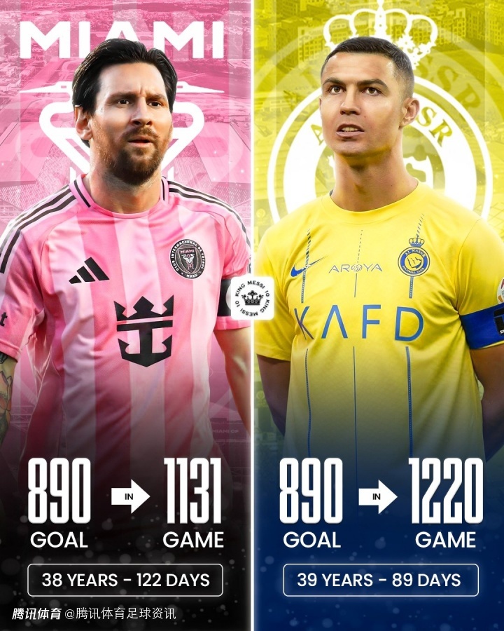此前C罗在39岁89天达成890球,所用场次1220场。