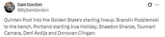 2025-10-25 09:50北京时间10月25日,NBA常规赛继续进行,勇士队背靠背对阵开拓者队。赛前,勇士队和开拓者队公布了本场比赛的首发阵容。