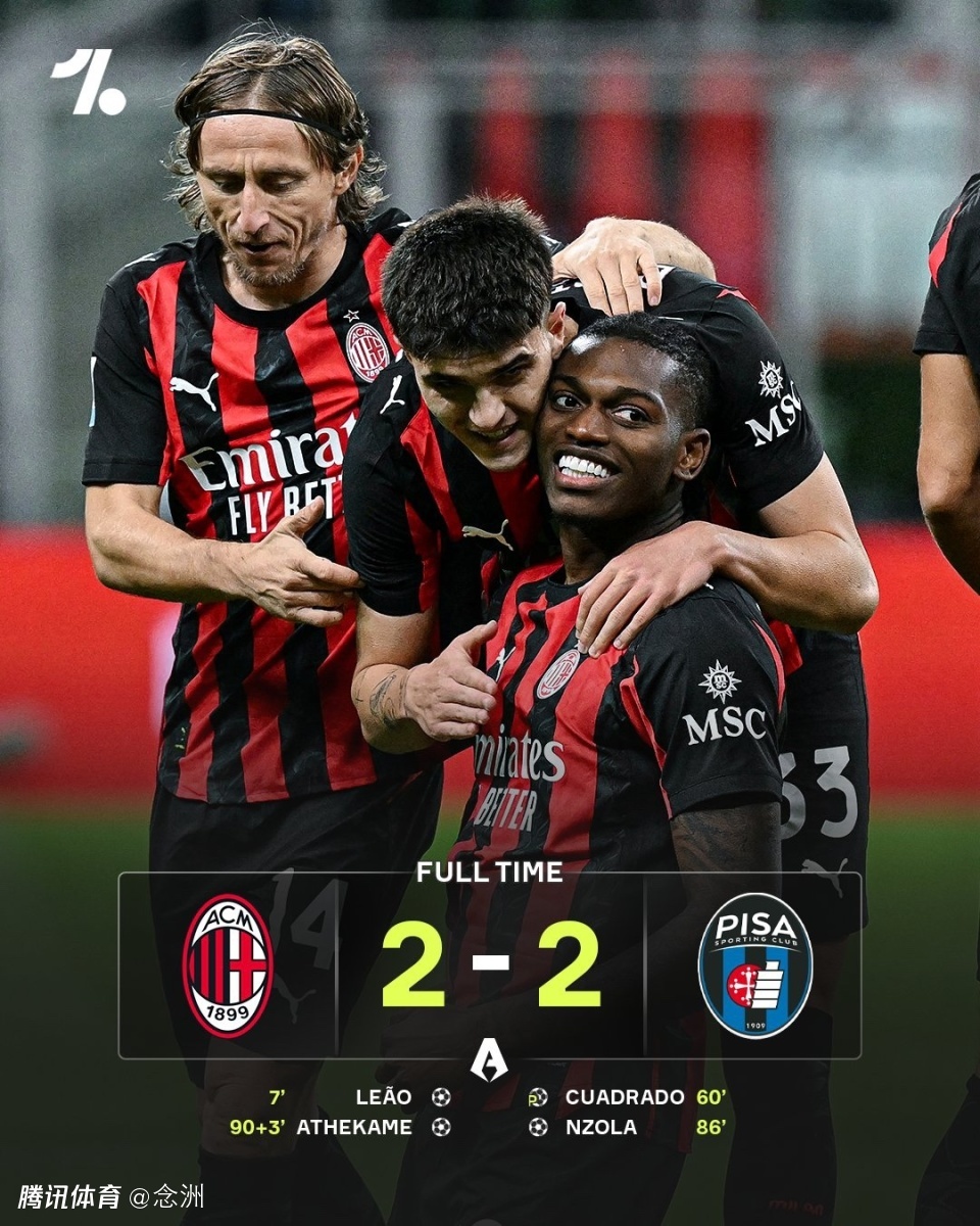 意甲第8轮,AC米兰主场2-2战平比萨,各项赛事连续8场不败,先赛的情况下2分优势领跑。莱奥首开纪录,德温特手球犯规送点,夸德拉多点射破门,恩佐拉破门反超,阿特卡梅替补绝平。