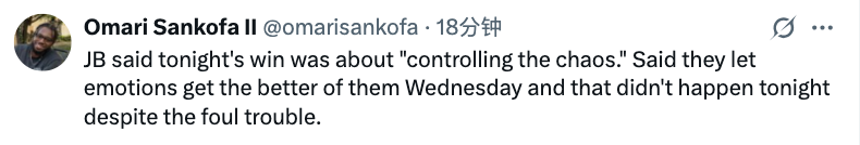 另外,比克斯塔夫也表示今晚的胜利关键在于 “掌控混乱局面”,他表示球队上场比赛曾被情绪左右,但今晚即便陷入犯规麻烦,也没有重蹈覆辙。