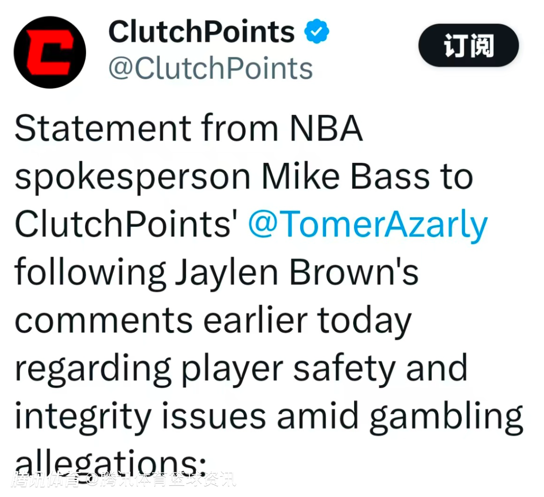 2025-10-25 11:50北京时间10月25日,NBA发言人迈克-巴斯就杰伦-布朗的言论发表声明。